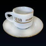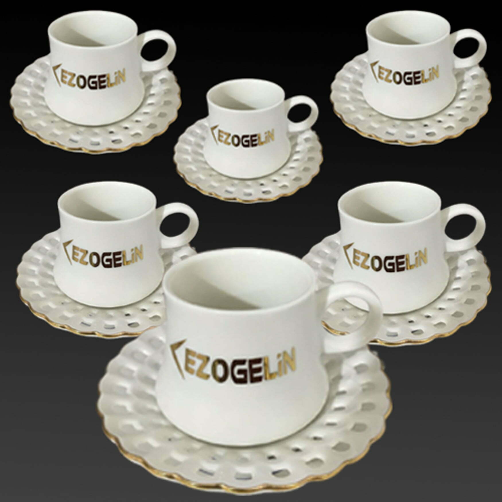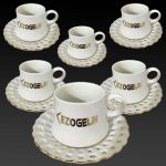 Altın Yaldızlı Porselen Kahve Fincanı Takımı – 6 Adet yaldız deseni, ‘LOGOLU’ yazısı ve kahve desenlerinin tamamı el işçiliği ile desenlenmiş olup kumlama tekniği kullanılarak cam aşındırılmıştır.