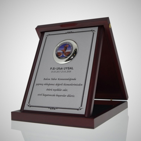 Bu plaketler genellikle yüksek kaliteli ahşap malzemelerinden yapılmış olup, özel olarak tasarlanabilir ve kişiselleştirilebilir. Genellikle birim amblemleri, askeri semboller, alıntılar veya kişisel mesajlar gibi özel detaylar içerebilirler. Ahşap plaketlerin göze çarpan ve dayanıklı yapısı, askeri birimlerde uzun ömürlü bir hatıra olarak saklanmalarını sağlar.