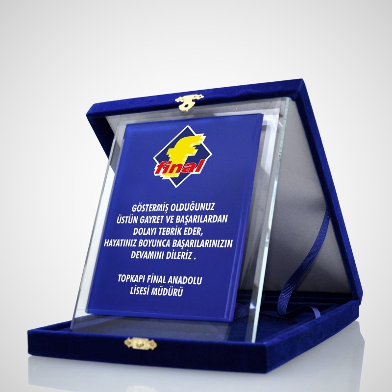 Ana Sayfa PLAKETLER CAM PLAKETLER Albüm Kristal Plaket Mavi Kadife Kutulu Başarı Tebrik Kristal Plaket 15×20