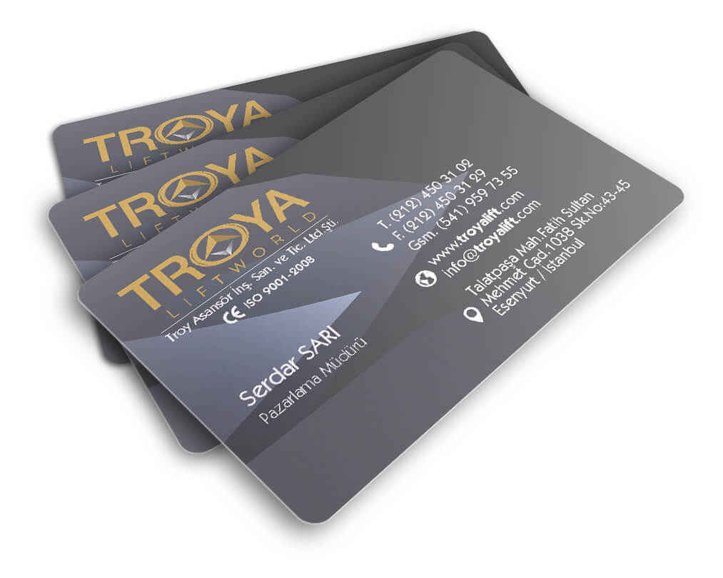 Her sektöre özel plastik kartvizitleri standart olarak 0.500 mikron, Cmyk+Kabartma Lak+Oval kesim olarak Üretilmektedir.